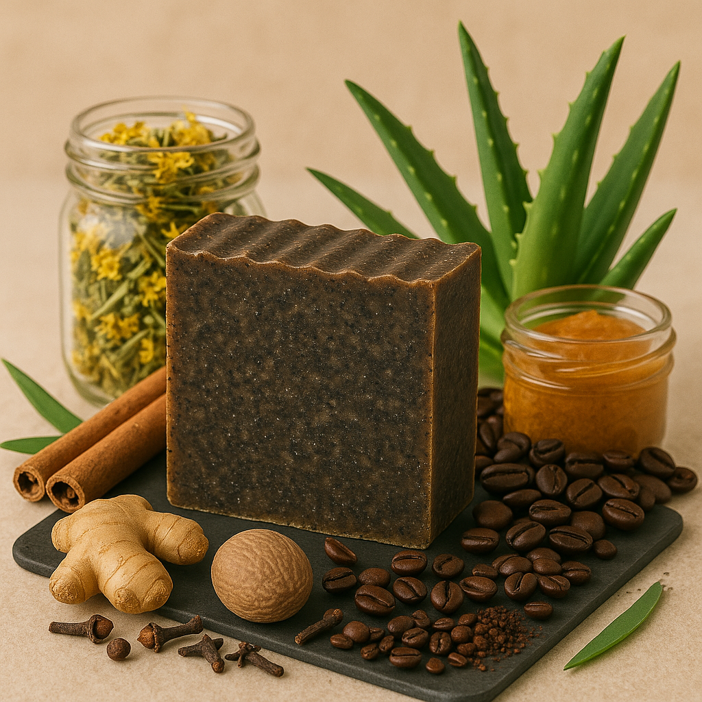 A bold mix of coffee and pumpkin purée meets warming spices—cinnamon, ginger, nutmeg, allspice, and cloves—for gentle exfoliation and a naturally invigorating cleanse. Enhanced with tea tree oil for clarity and a full spectrum of skin-healing herbs—arnica, plantain, shavegrass, calendula, and yarrow—this bar goes beyond nourishment, helping calm irritation and support skin recovery. Rounded out with a rich base of tallow, olive oil, coconut oil, castor oil, and aloe vera, it leaves skin moisturized, refreshed, and balanced.