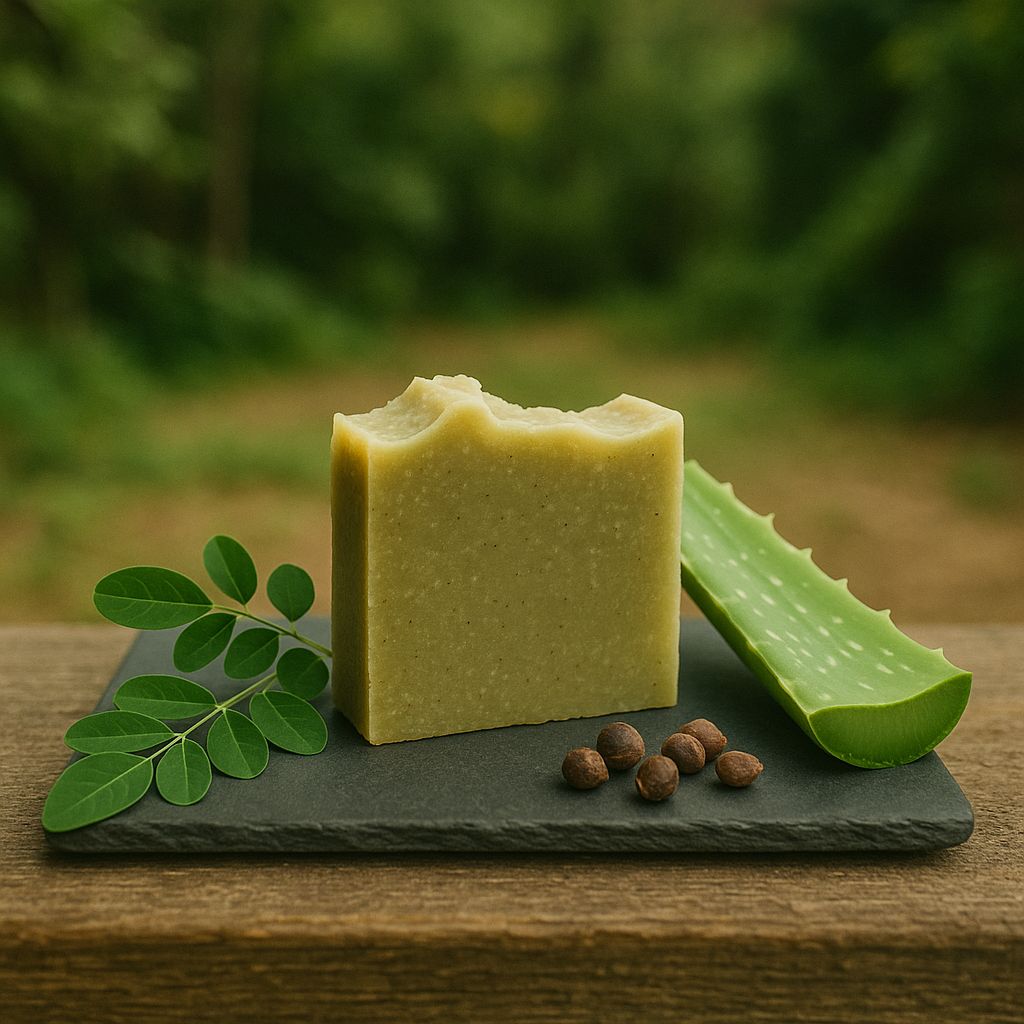 Best for: Eczema flare-ups, psoriasis, inflamed or itchy skin, repairing the skin barrier, and daily cleansing with nutrient-dense herbal support. Because this bar combines moringa + aloe + tea tree + the five healing herbs, it stands as a top-tier eczema heavyweight in your collection.