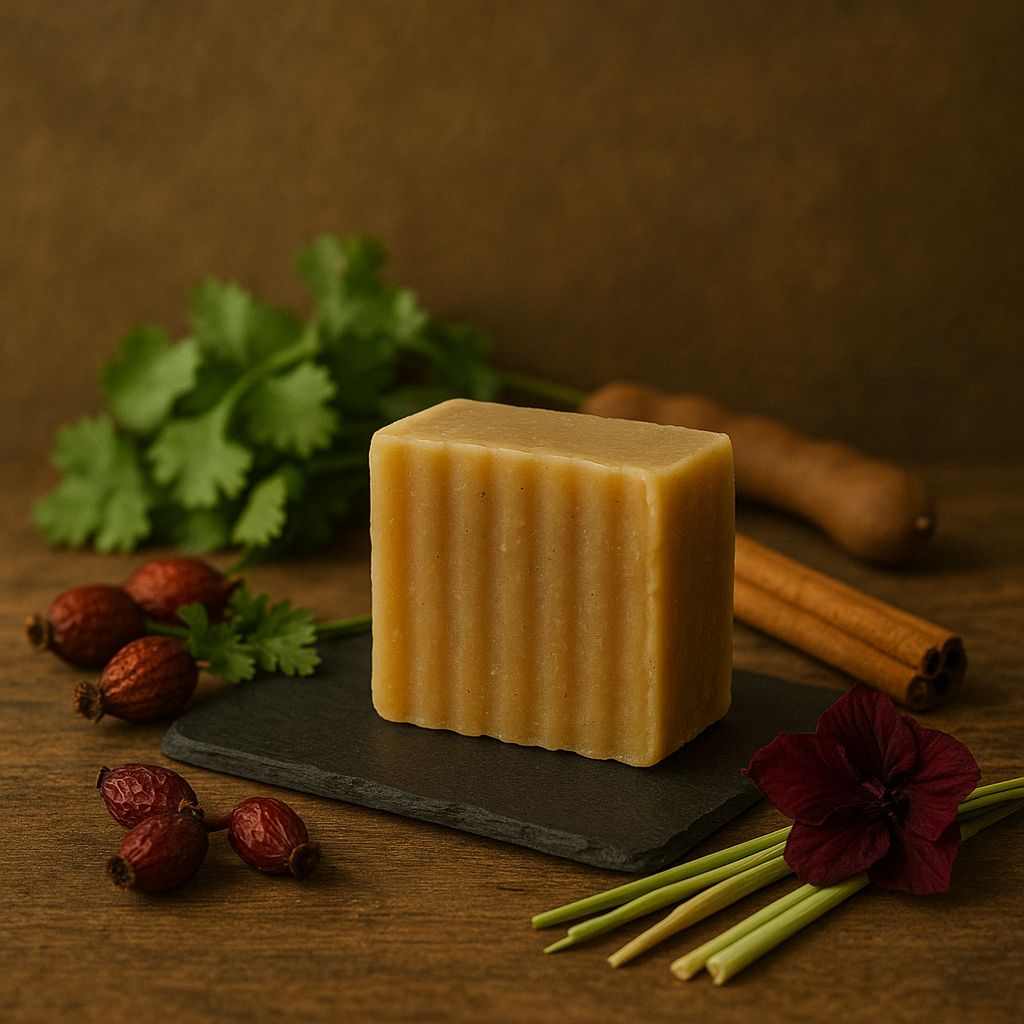 A vibrant fusion of rose hips, cilantro, tamarindo, cinnamon, hibiscus, and lemongrass delivers antioxidants, gentle exfoliation, and natural toning for renewed, glowing skin. Strengthened with a full healing herb spectrum — arnica, plantain, calendula, yarrow, and shavegrass — this bar calms inflammation, soothes irritation, and supports repair. Built on a nourishing base of tallow, olive, coconut, and castor oils, it creates a creamy, conditioning lather that both restores and protects.