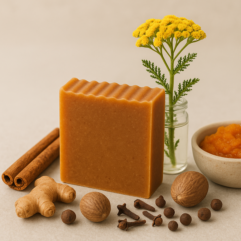 This autumn-inspired bar blends pumpkin purée with warm spices like cinnamon, ginger, nutmeg, allspice, and cloves to gently exfoliate and awaken the skin. Infused with tallow and healing herbs—arnica, plantain, shavegrass, calendula, and yarrow—it calms irritation while deeply moisturizing. Balanced with extra virgin olive oil, coconut oil, and castor oil, this soap nourishes and restores the skin barrier, making it perfect for dry, sensitive, or tired skin in need of seasonal renewal.