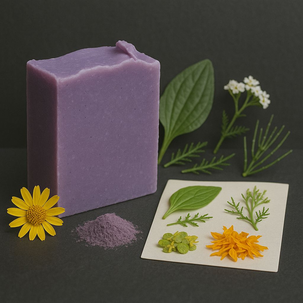 Powered by a full spectrum of healing herbs — arnica, plantain, shavegrass, calendula, and yarrow — this bar is designed to calm inflammation, reduce redness, and support skin repair. Tea tree oil adds clarifying strength, keeping the skin balanced and protected, while aloe vera soothes and hydrates with cooling relief. Built on a nourishing base of tallow, extra virgin olive oil, coconut oil, and castor oil, it lathers into a creamy, conditioning wash. Mica powder lends a natural touch of color, giving this bar a vibrant, herbal look.