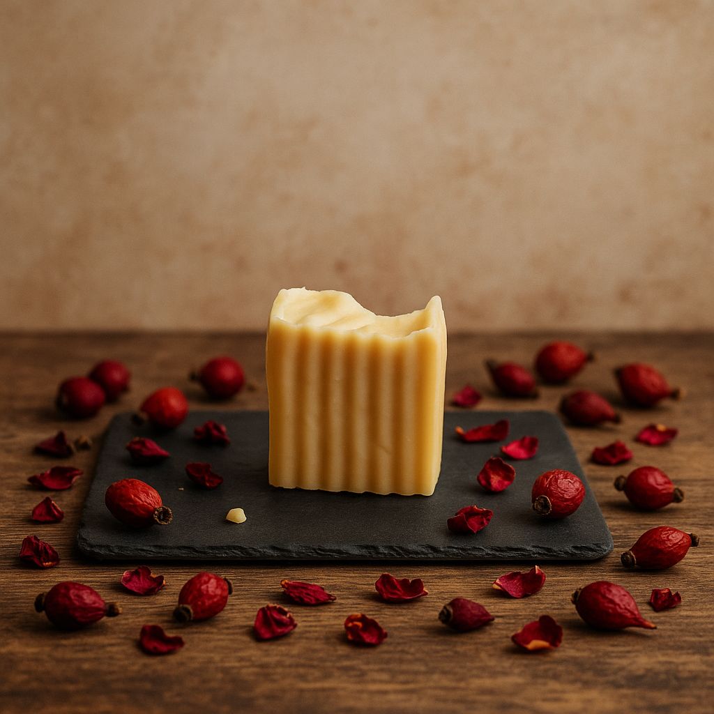 A rejuvenating blend of rose hips and restorative herbs makes this bar a skin-healing powerhouse. Rose hips provide vitamin C and natural brightening, while arnica, shavegrass, calendula, yarrow, and plantain work together to calm irritation, strengthen, and restore balance. Grounded in a rich base of tallow, coconut, olive, and castor oils, the bar creates a creamy, conditioning lather that deeply nourishes and supports skin renewal.