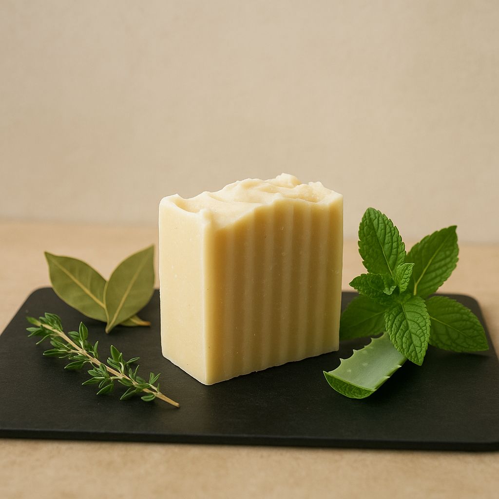 A bold mix of thyme, bay leaf, and mint creates a naturally purifying cleanse, while tea tree oil adds clarifying power to combat irritation and impurities. Balanced with a full spectrum of healing herbs — arnica, plantain, shavegrass, calendula, and yarrow — this bar goes beyond cleansing, working to calm inflammation, soothe sensitive skin, and restore balance. Grounded in a nourishing base of tallow, extra virgin olive oil, coconut oil, castor oil, and aloe vera, it produces a creamy, conditioning lather that leaves skin refreshed, protected, and fortified.