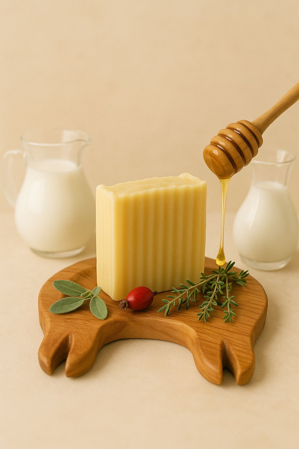 Ingredients: Rose Hip, Sage, Thyme, Tallow, Olive Oil, Coconut Oil, Castor Oil, Tea Tree Oil, NaOH (Lye), Cow Milk, Goat Milk, Honey